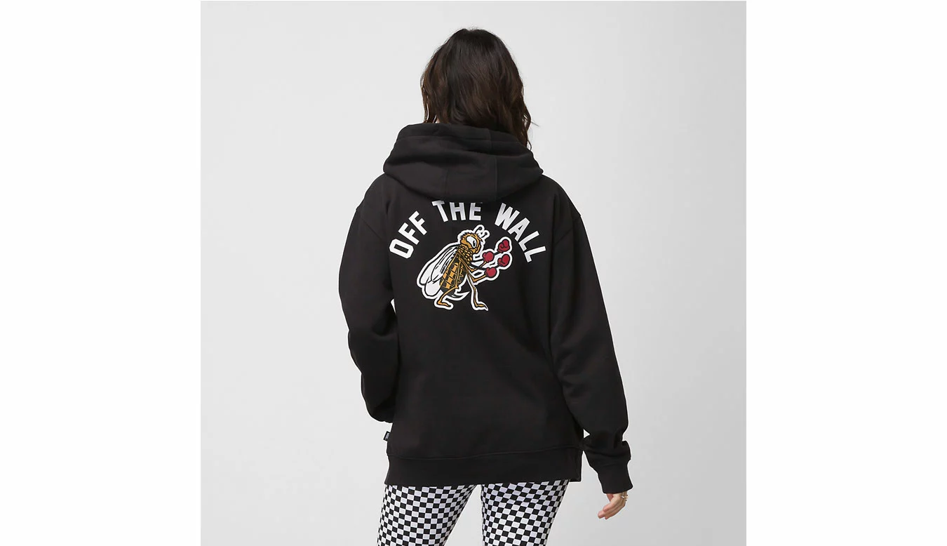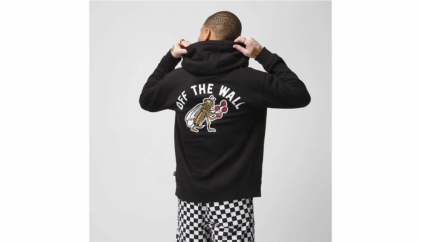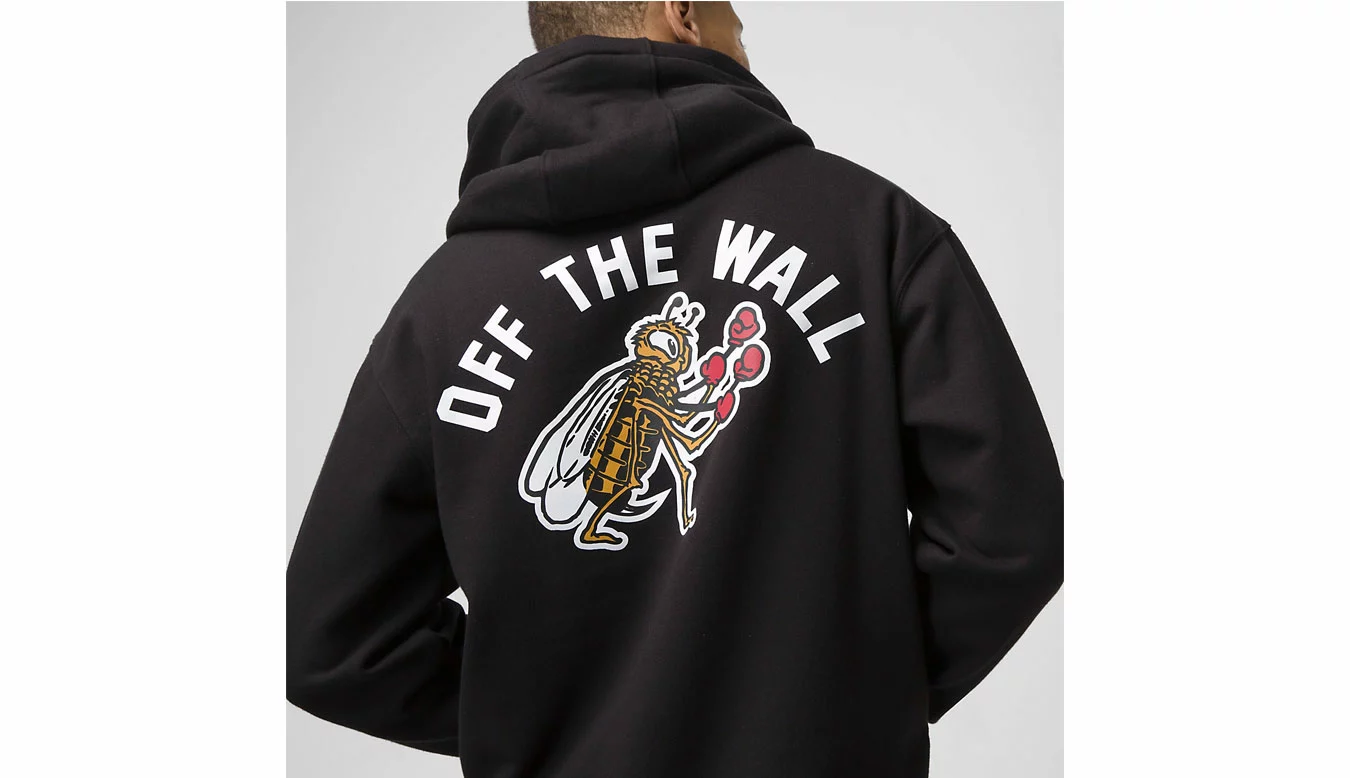 Le pull Checkerboard Research est un sweat à capuche en polaire 60 % coton et 40 % polyester avec une poche avant, un logo sérigraphié au centre de la poitrine et une sérigraphie d’abeille boxeuse au dos pour une ambiance rétro. Le mannequin mesure 6 pieds et porte une taille M.