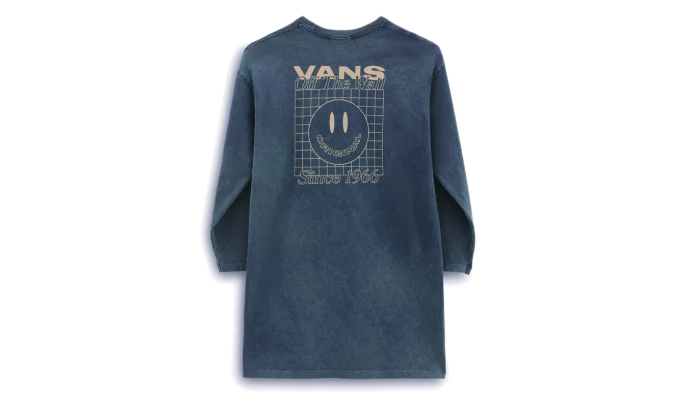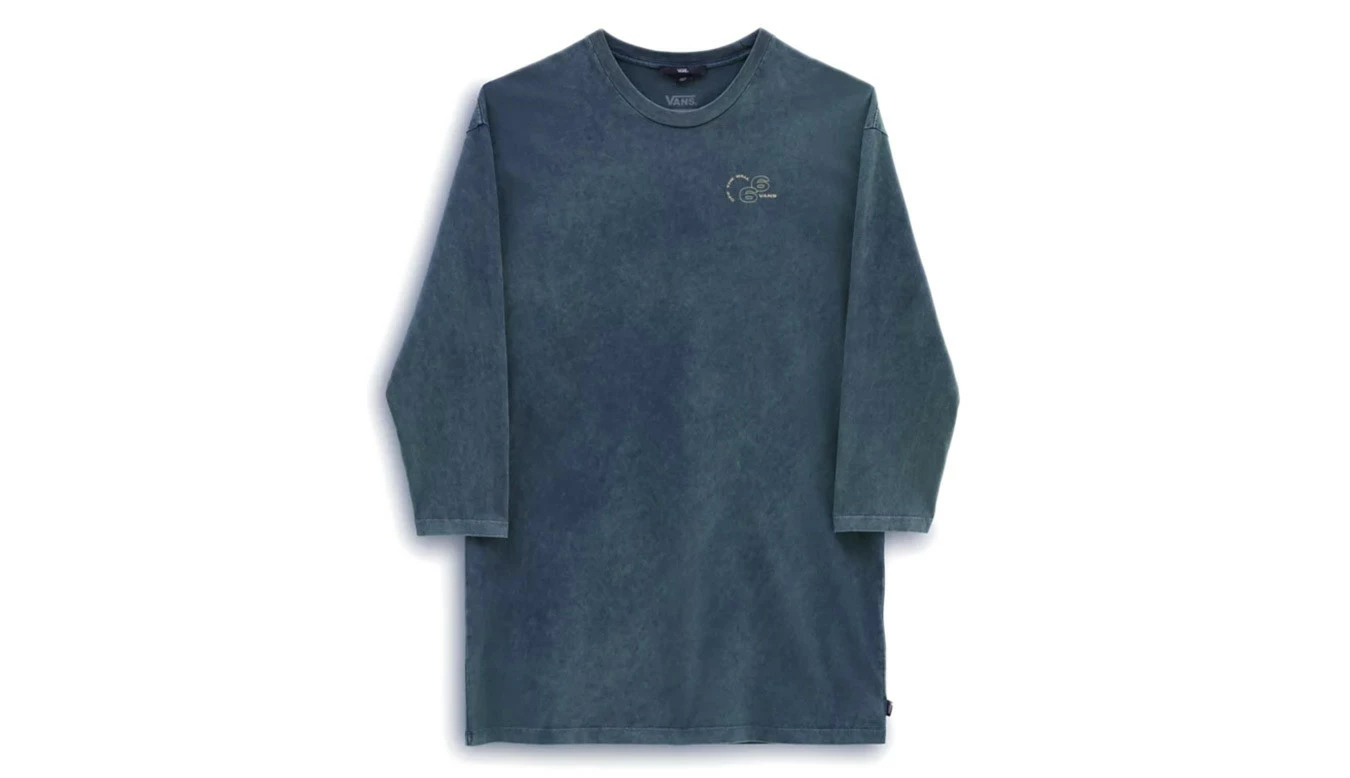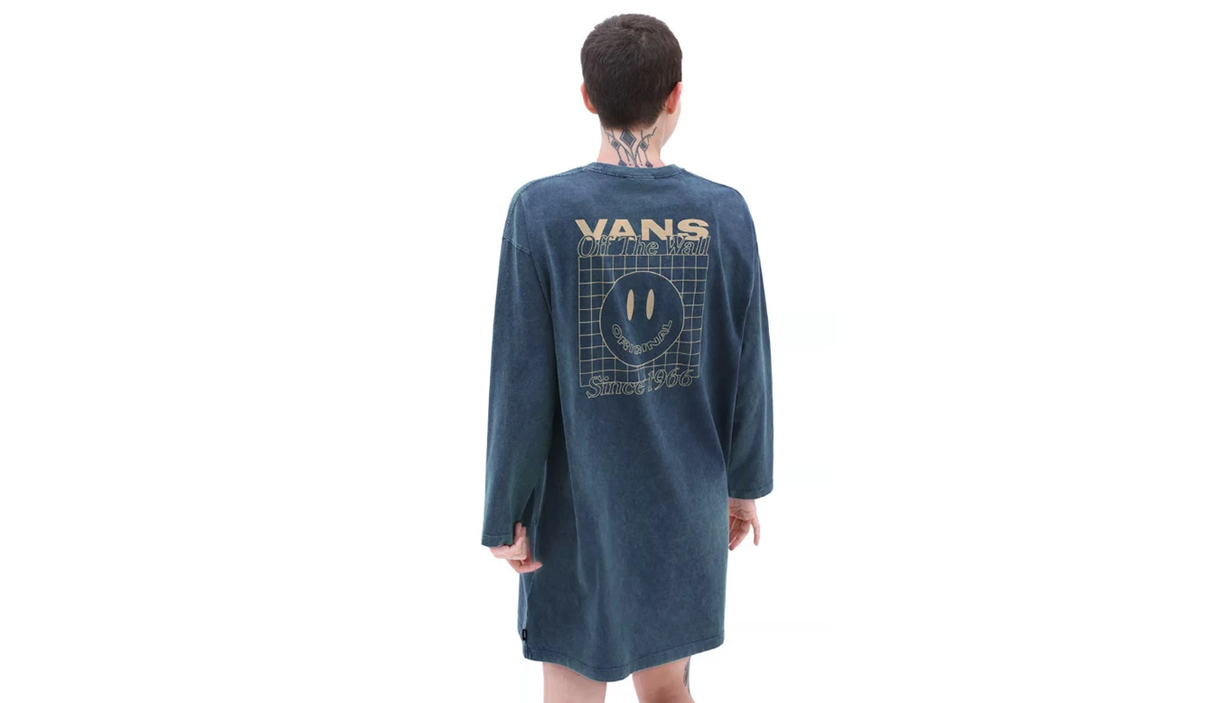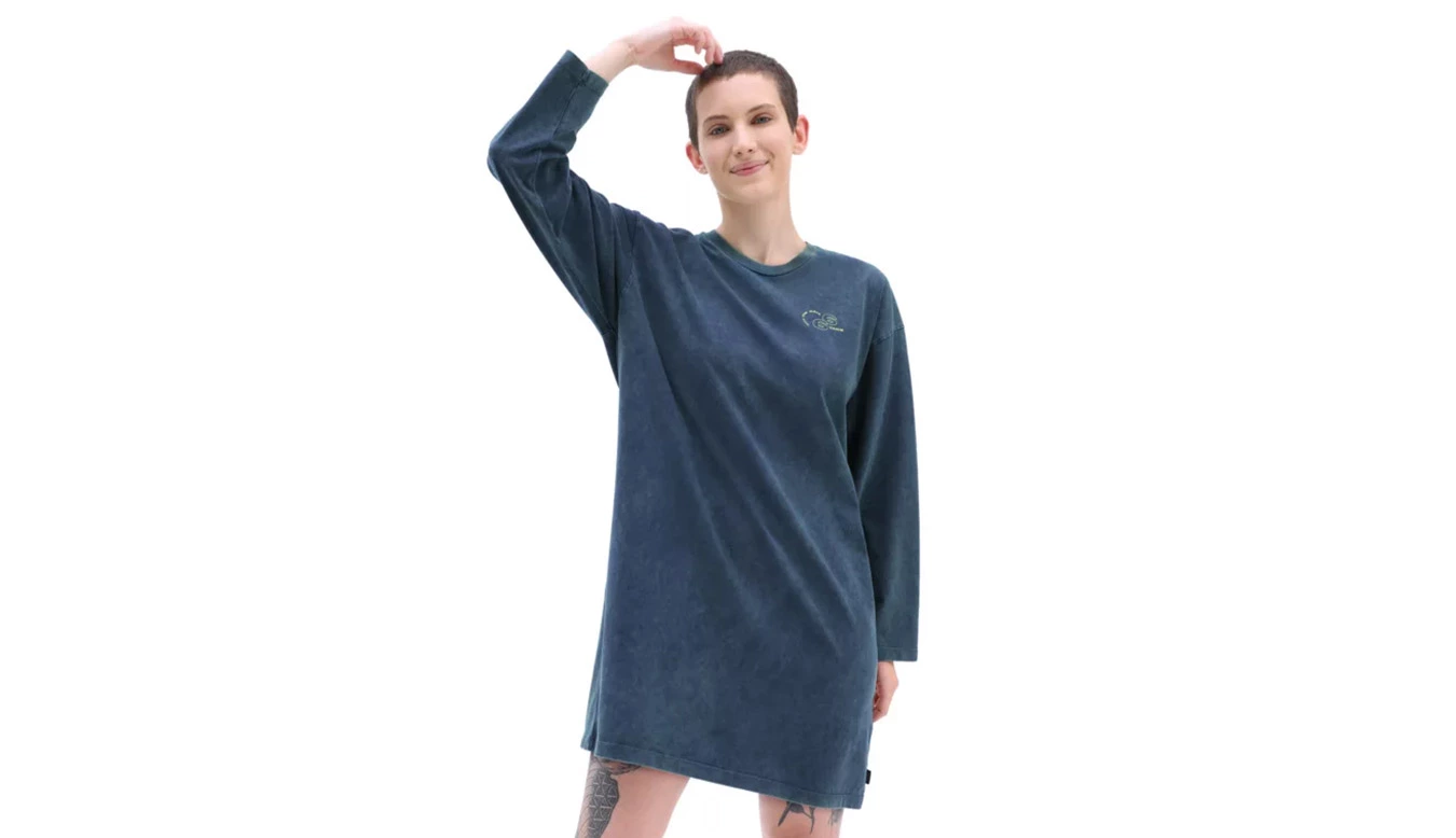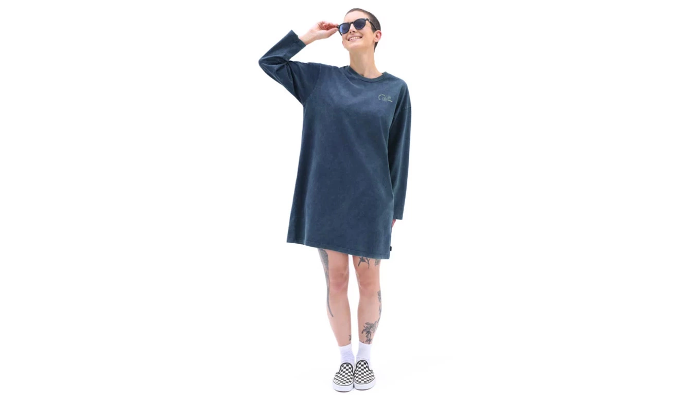 La robe à manches longues Mootoo de Vans est une robe t-shirt à manches longues de coupe décontractée. Il a un col ras du cou, des épaules tombantes et le logo Vans sur la poitrine gauche et dans le dos.