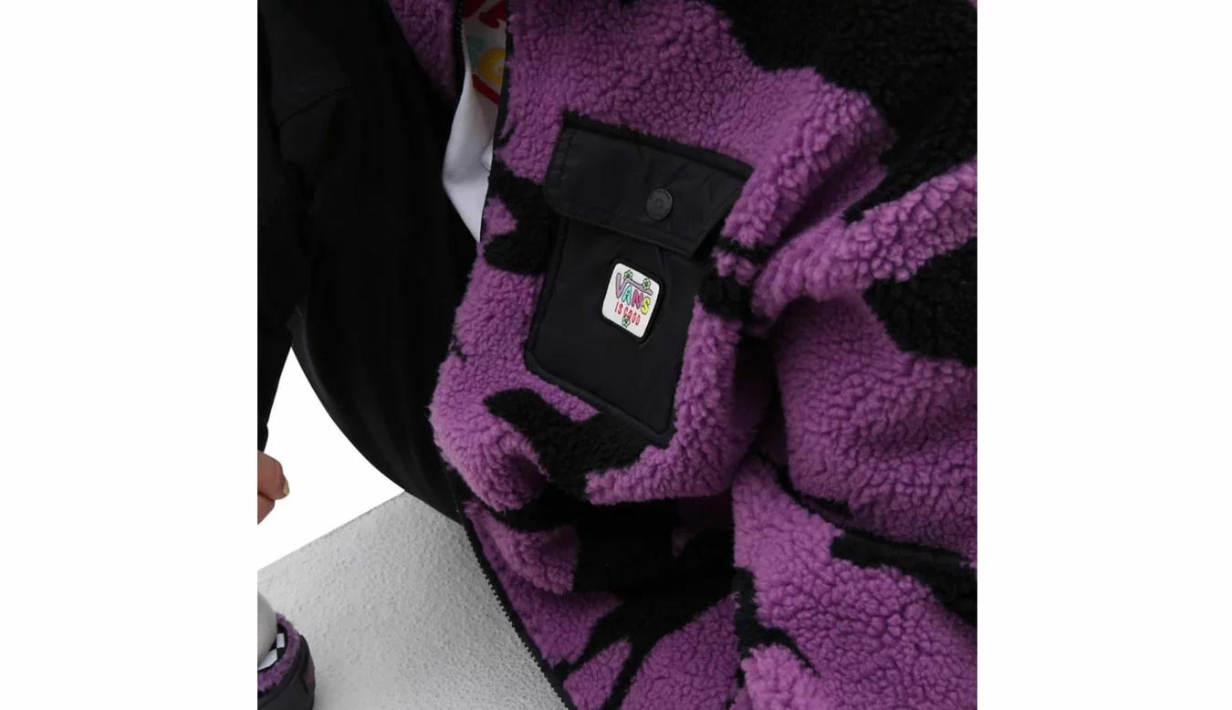 Inspirée du mantra #GOODFORYOU d’Irene Kim, la veste Sherpa Vans x IRENEISGOOD utilise des graphismes ludiques, des couleurs vives et des matériaux confortables pour donner vie au monde imaginatif de positivité que représente la marque IRENEISGOOD. Fabriquée en sherpa doux pour vous garder au chaud et confortable, cette veste apporte une touche de plaisir fantaisiste au style streetwear avec un imprimé violet et noir accrocheur. Une poche contrastante avec un patch logo complète le look.